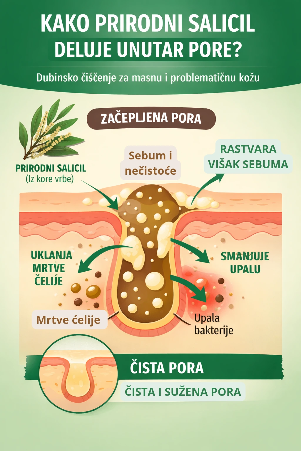 Da, prirodni salicil je jedan od najefikasnijih sastojaka za kožu sklonu aknama. Prodire duboko u pore, uklanja višak sebuma i nečistoće, čime pomaže u smanjenju bubuljica i sprečava nastanak novih nepravilnosti.